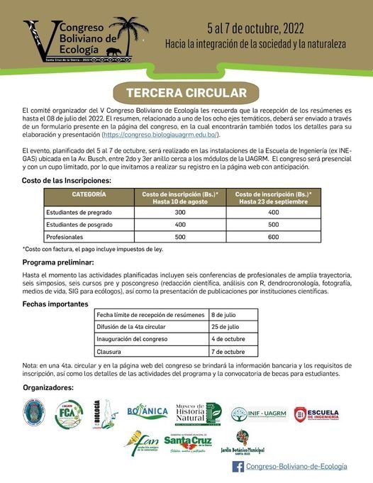 6 Jul 2022 Congreso Boliviano de Ecologia – III Circular por Observatorio Ambiental UAGRM | publicado en: Noticias | 0 Comparte este artículo por: