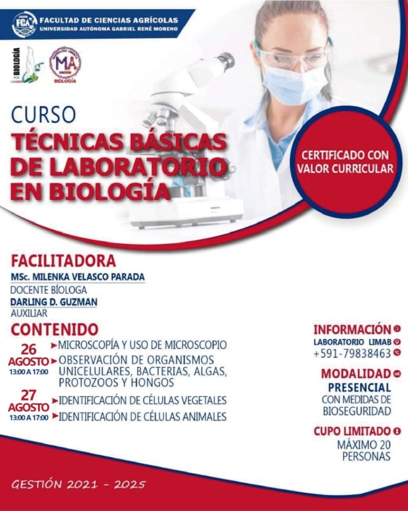 22 Ago 2022 Curso: Técnicas básicas de laboratorio en Biología por Observatorio Ambiental UAGRM | publicado en: Noticias | 0 Comparte este artículo por: