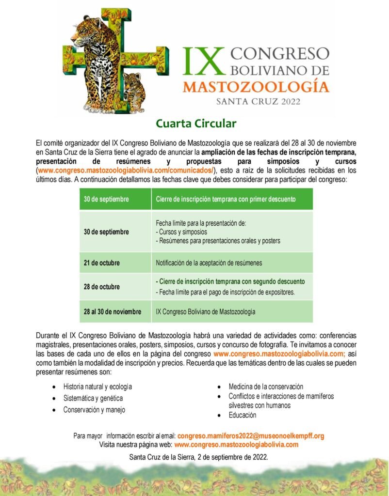 1 Sep 2022 IX Congreso Boliviano de Mastozoología por Observatorio Ambiental UAGRM | publicado en: Noticias | 0 Comparte este artículo por: